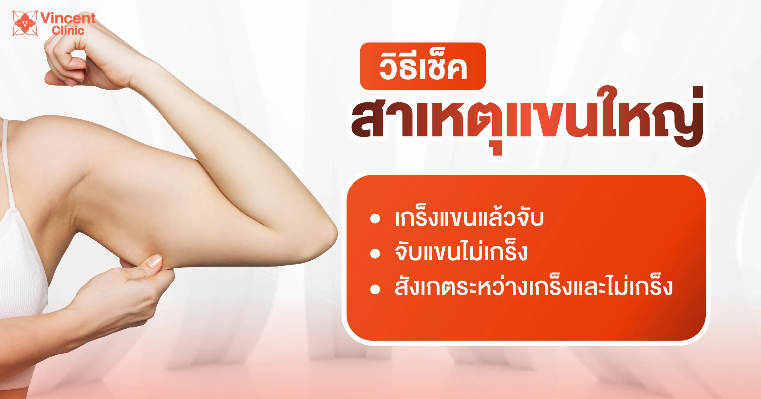 - เกร็งกล้ามเนื้อแขน ลองเกร็งต้นแขน แล้วสังเกตดูว่ากล้ามเนื้อแขนมีขนาดใหญ่ หรือดูปูดมากแค่ไหน หากกล้ามเนื้อดูปูดเป็นลูกชัดเจน และสัมผัสได้ถึงแข็งของกล้ามเนื้อ แสดงว่าต้นแขนใหญ่จากกล้ามเนื้อ ซึ่งสามารถฉีดโบท็อกลดกล้ามแขนได้